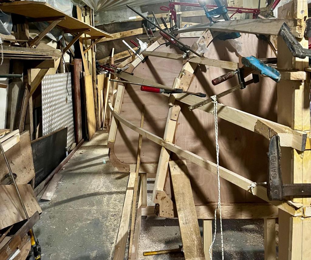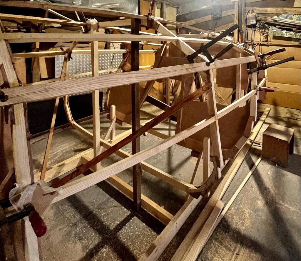 After ensuring that the frames are centered, we started putting the stringers in pairs on each side and allowed them some time to stiffen. It’s a job that takes time to achieve a solidly glued and stiff structure. Each stringer works in its own way and affects different areas of the boat, so we paid extra attention to this stage of building since there is no going back for readjustments.