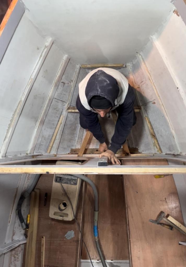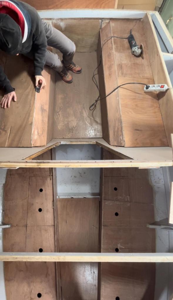 Both port and starboard beds are done, custom-fitted for me with storage underneath for gear and food. Bonus: tweaking the storage gave me extra headroom inside—small changes, big wins! 💪