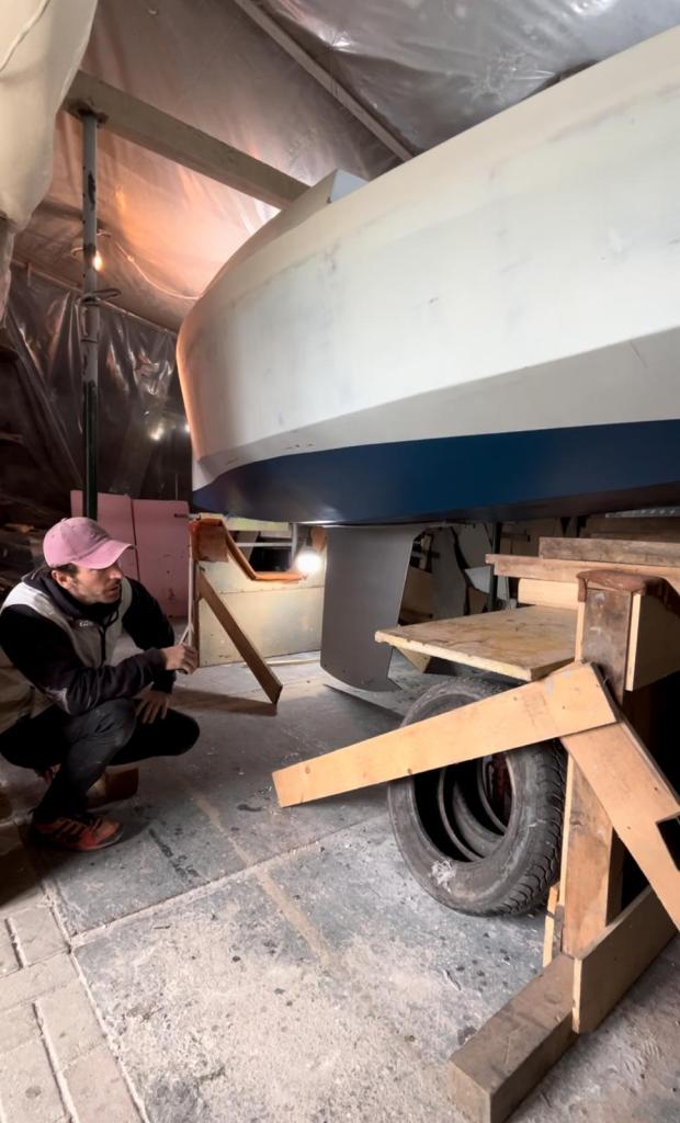 Things have been moving quickly lately. With the boat lifted, we aligned the rudder and centerboard—perfectly, and marked the waterline. A few coats of primer later, and we rolled on the first layer of antifouling. It’s a small but satisfying thing, seeing actual color start to cover the hull.